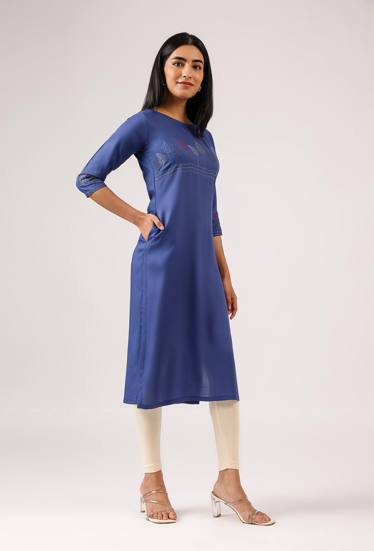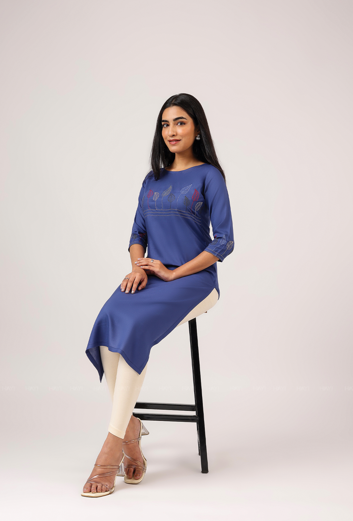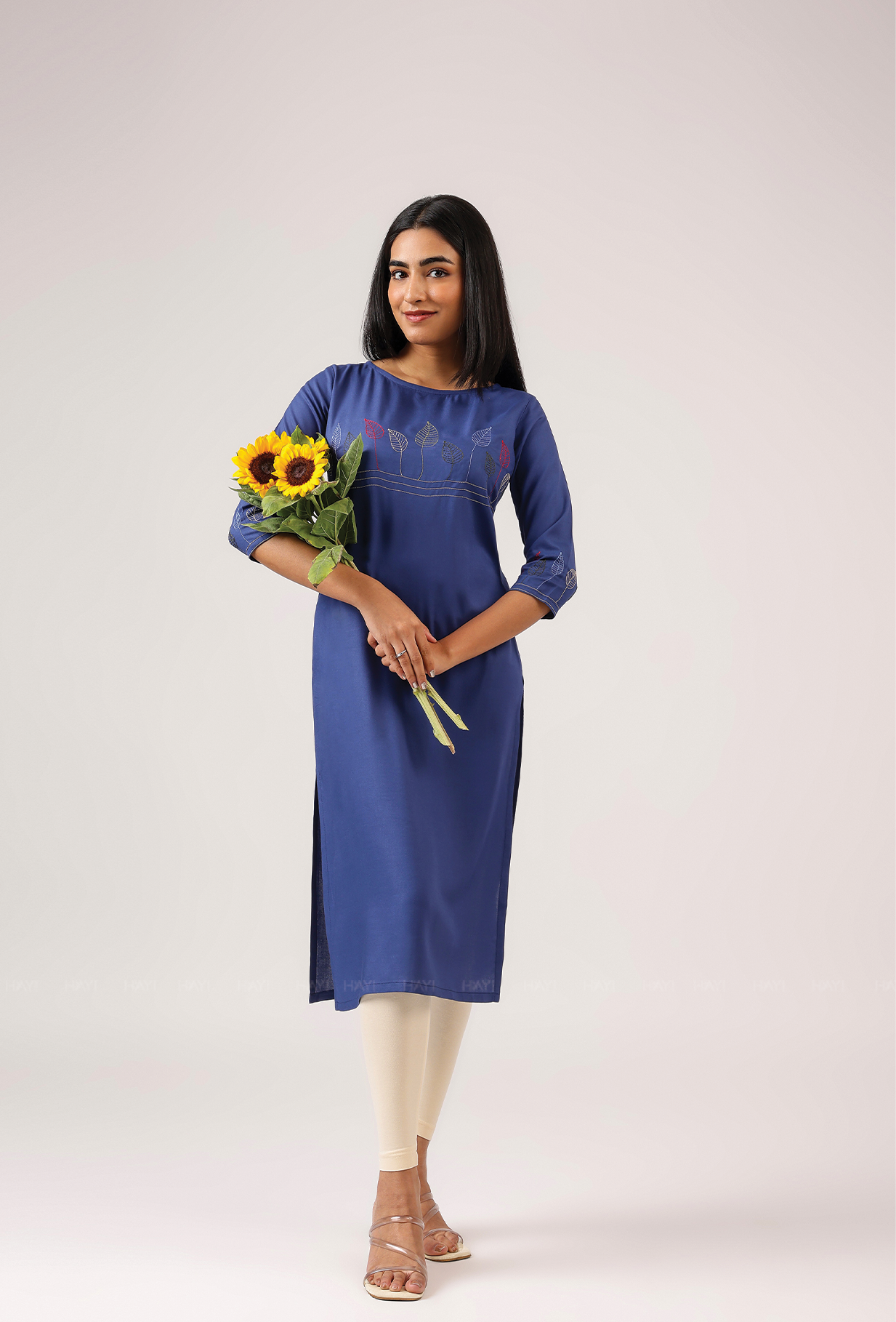 Let subtle charm and clean cuts take center stage in this elegant blue embroidered straight kurti with a perfect blend of comfort and class.